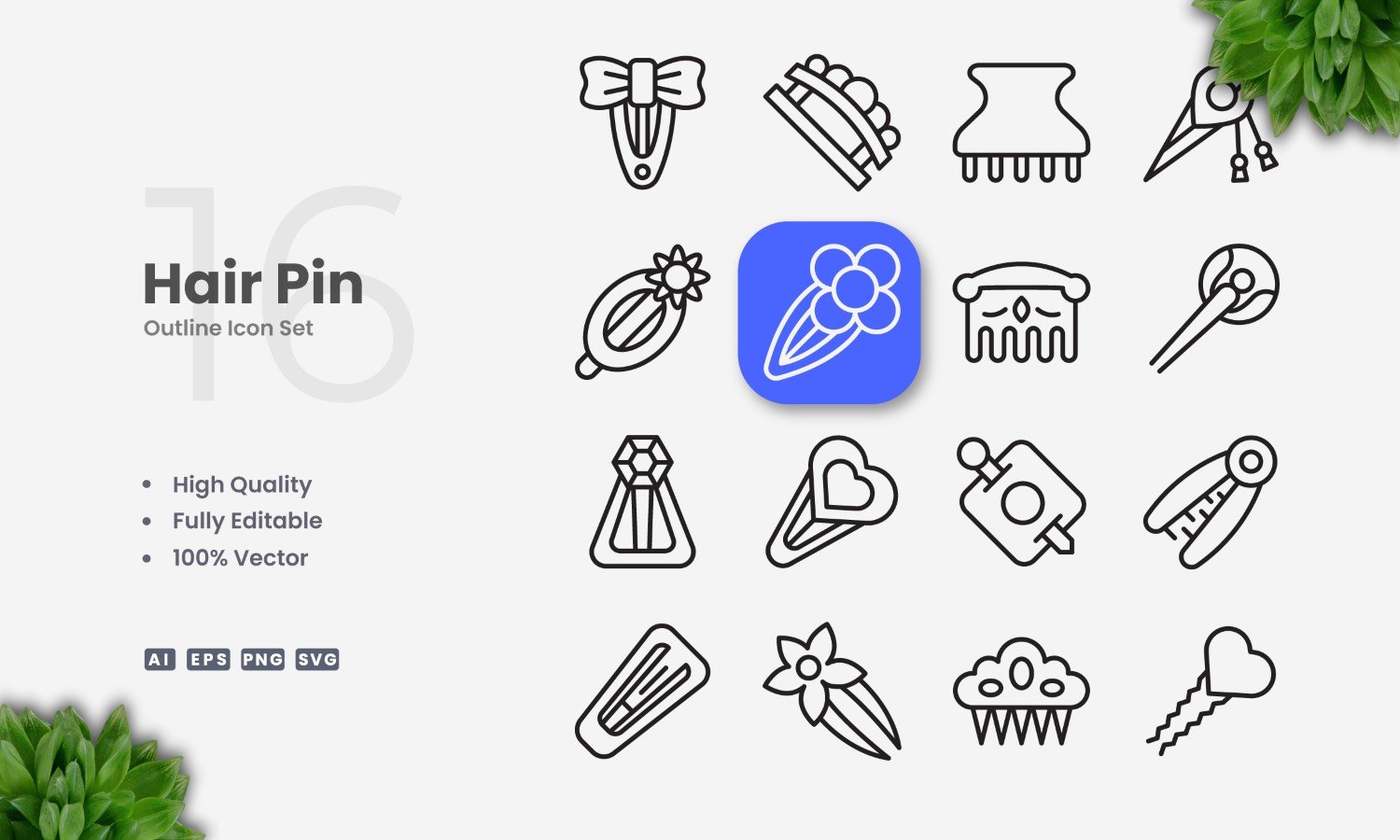 Set of 16 Hair Pin outline icons | Simple and clean design, perfect for websites, mobile apps, books, social media, infographics, flyer, print, banners, posters and many more. To resize, change color, or edit stroke weight, you can easily edit on vector software like Adobe Illustrator and CorelDRAW.
