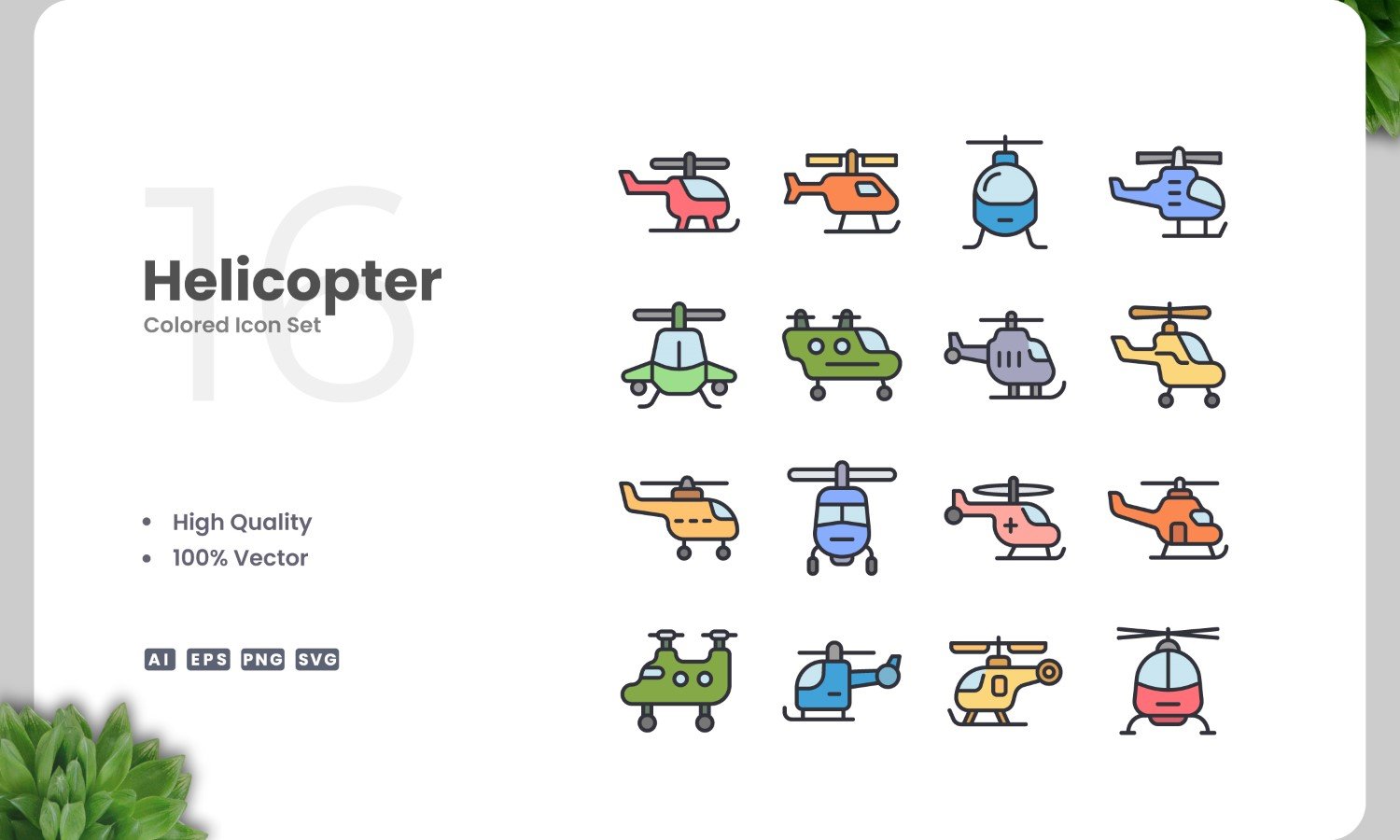 Set of 16 Helicopter colored icons | Simple and clean design, perfect for websites, mobile apps, books, social media, infographics, flyer, print, banners, posters and many more. To resize or change color you can easily edit on vector software like Adobe Illustrator and CorelDRAW.