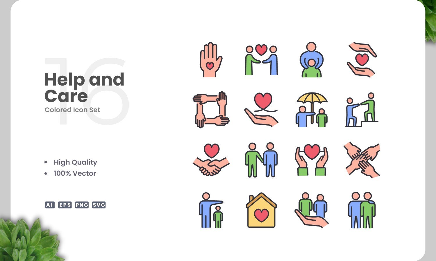 Set of 16 Help and Care colored icons | Simple and clean design, perfect for websites, mobile apps, books, social media, infographics, flyer, print, banners, posters and many more. To resize or change color you can easily edit on vector software like Adobe Illustrator and CorelDRAW.
