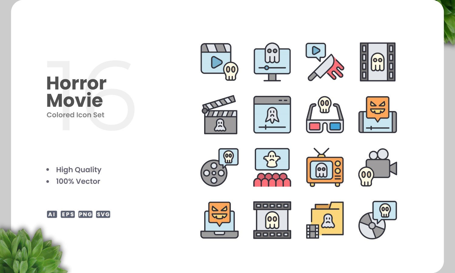 Set of 16 Horror Movie colored icons | Simple and clean design, perfect for websites, mobile apps, books, social media, infographics, flyer, print, banners, posters and many more. To resize or change color you can easily edit on vector software like Adobe Illustrator and CorelDRAW.