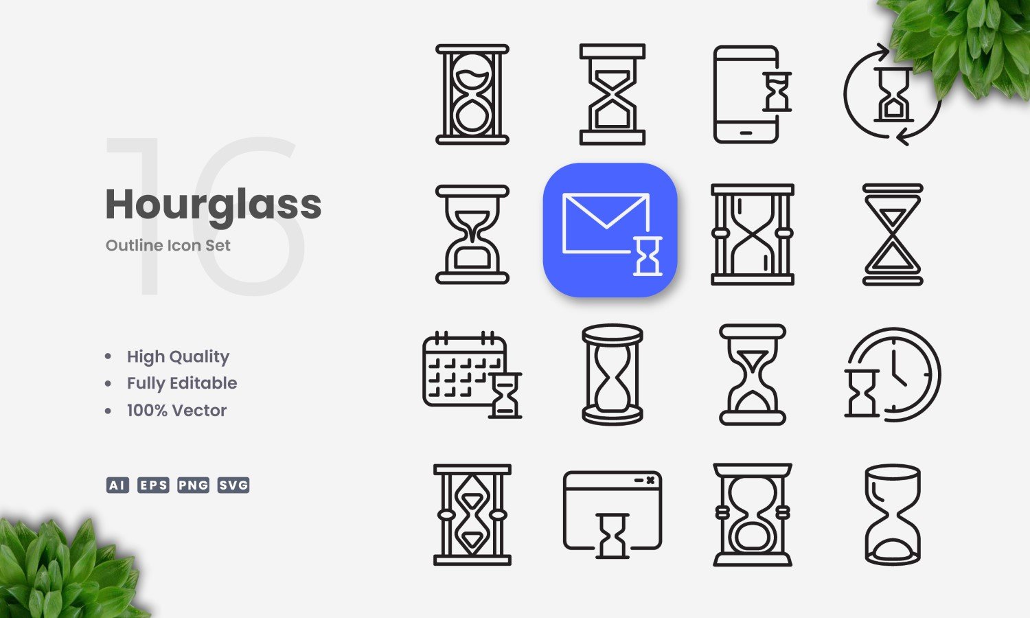 Set of 16 Hourglass outline icons | Simple and clean design, perfect for websites, mobile apps, books, social media, infographics, flyer, print, banners, posters and many more. To resize, change color, or edit stroke weight, you can easily edit on vector software like Adobe Illustrator and CorelDRAW.