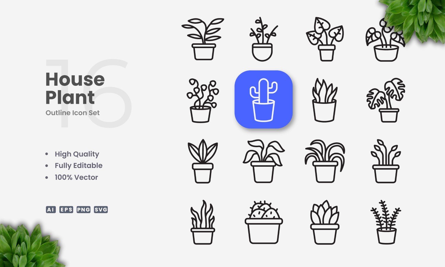 16 House Plant Outline Icon Set
