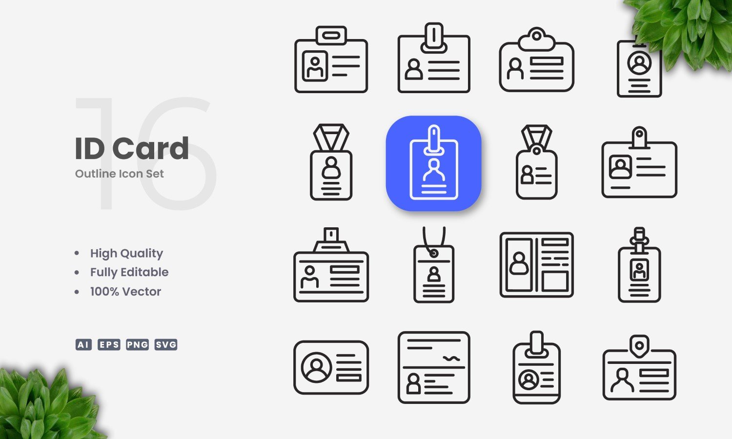 Set of 16 Id Card outline icons | Simple and clean design, perfect for websites, mobile apps, books, social media, infographics, flyer, print, banners, posters and many more. To resize, change color, or edit stroke weight, you can easily edit on vector software like Adobe Illustrator and CorelDRAW.