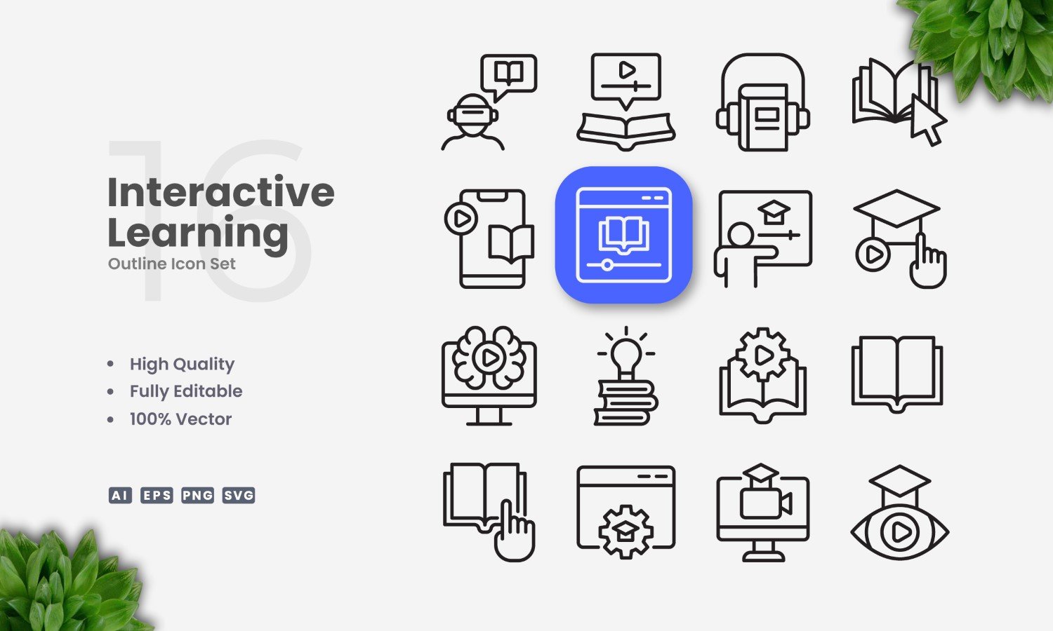 Set of 16 Interactive Learning outline icons | Simple and clean design, perfect for websites, mobile apps, books, social media, infographics, flyer, print, banners, posters and many more. To resize, change color, or edit stroke weight, you can easily edit on vector software like Adobe Illustrator and CorelDRAW.