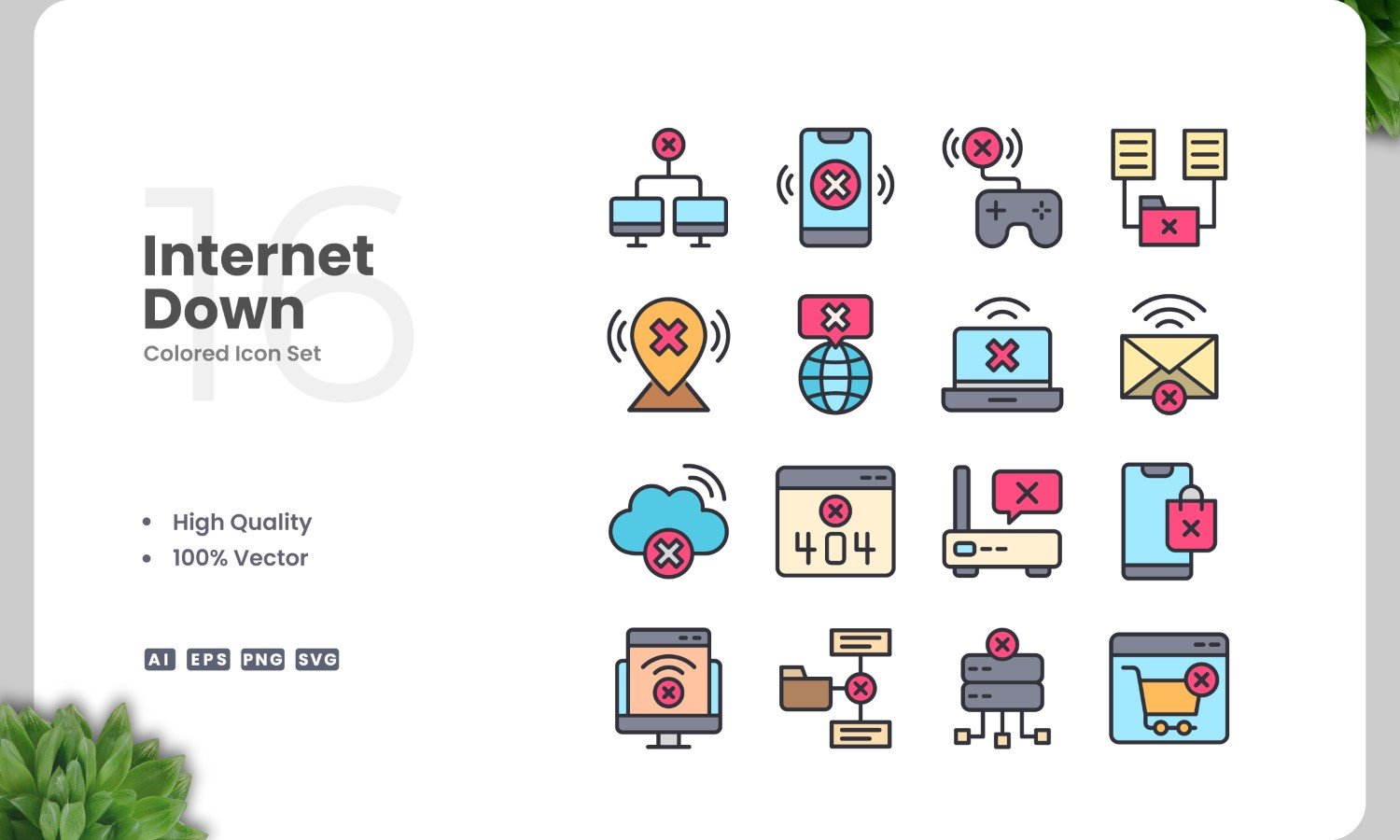 Set of 16 Internet Down colored icons | Simple and clean design, perfect for websites, mobile apps, books, social media, infographics, flyer, print, banners, posters and many more. To resize or change color you can easily edit on vector software like Adobe Illustrator and CorelDRAW.