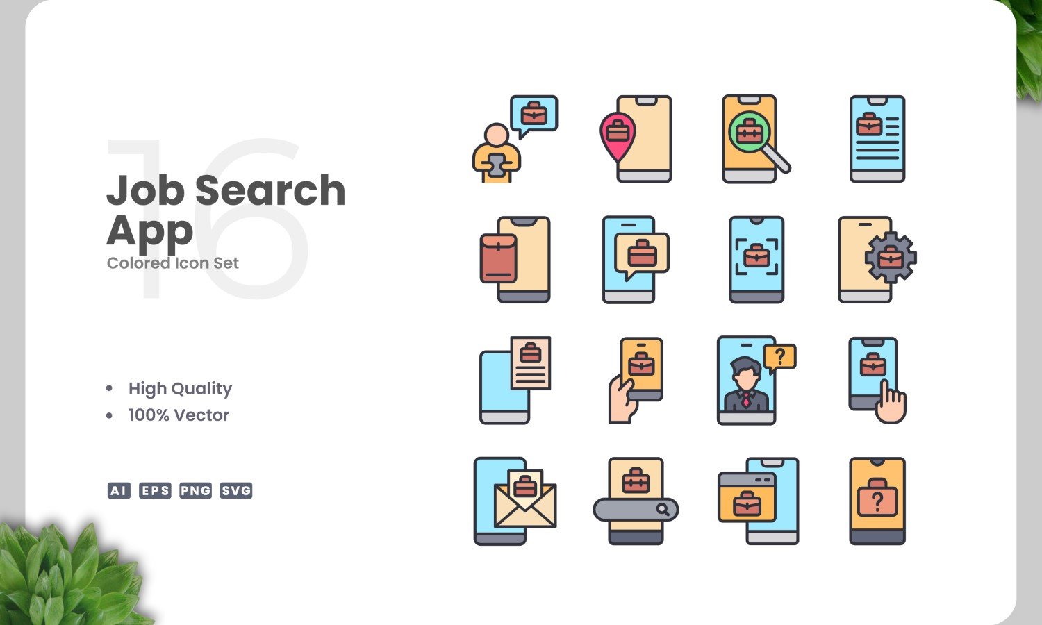 Set of 16 Job Search App colored icons | Simple and clean design, perfect for websites, mobile apps, books, social media, infographics, flyer, print, banners, posters and many more. To resize or change color you can easily edit on vector software like Adobe Illustrator and CorelDRAW.