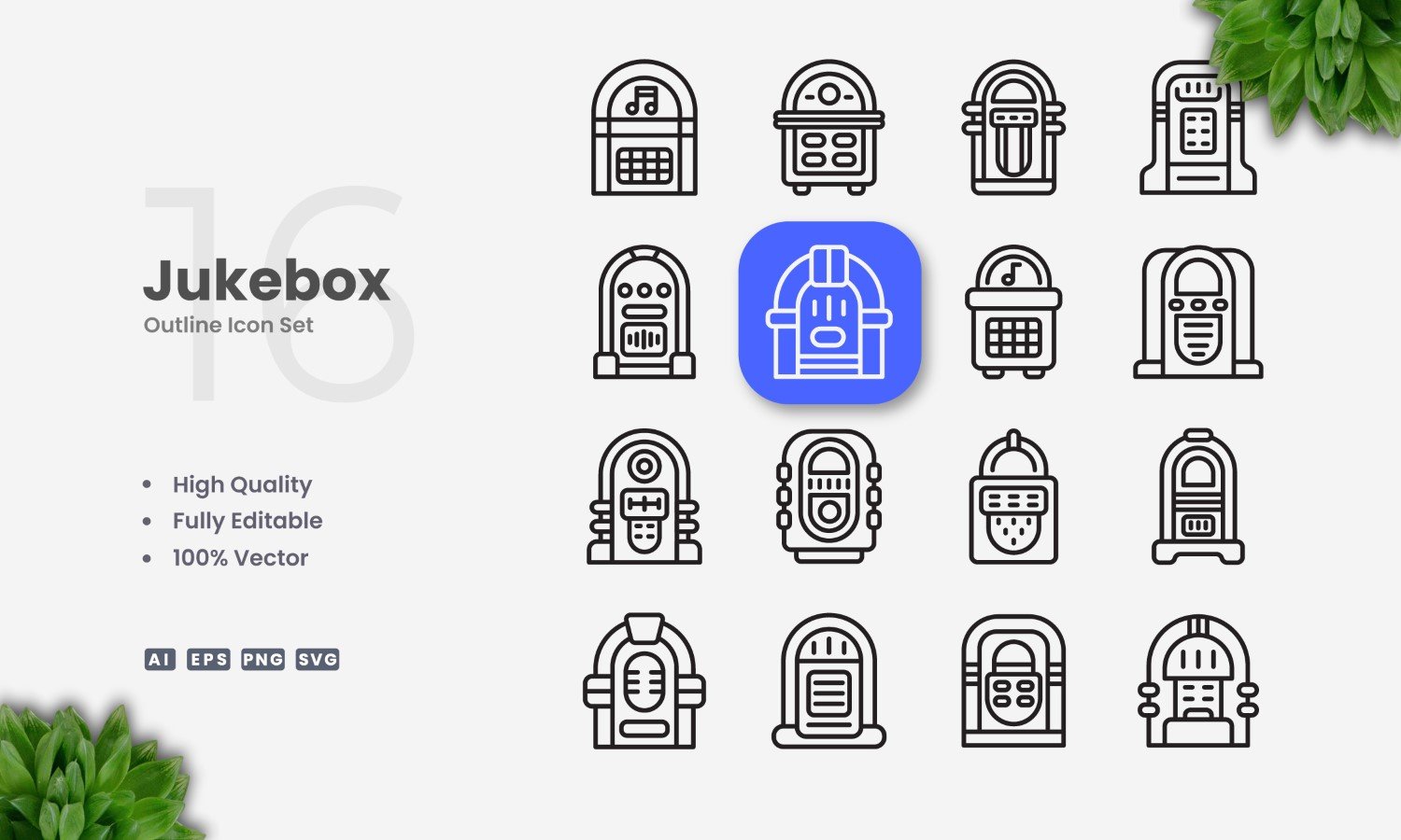 Set of 16 Jukebox outline icons | Simple and clean design, perfect for websites, mobile apps, books, social media, infographics, flyer, print, banners, posters and many more. To resize, change color, or edit stroke weight, you can easily edit on vector software like Adobe Illustrator and CorelDRAW.