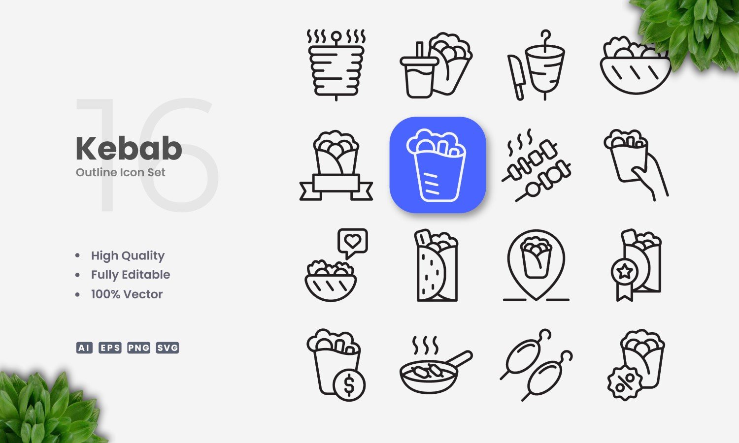 Set of 16 Kebab outline icons | Simple and clean design, perfect for websites, mobile apps, books, social media, infographics, flyer, print, banners, posters and many more. To resize, change color, or edit stroke weight, you can easily edit on vector software like Adobe Illustrator and CorelDRAW.