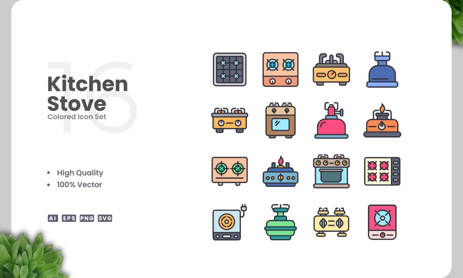 Set of 16 Kitchen Stove colored icons | Simple and clean design, perfect for websites, mobile apps, books, social media, infographics, flyer, print, banners, posters and many more. To resize or change color you can easily edit on vector software like Adobe Illustrator and CorelDRAW.