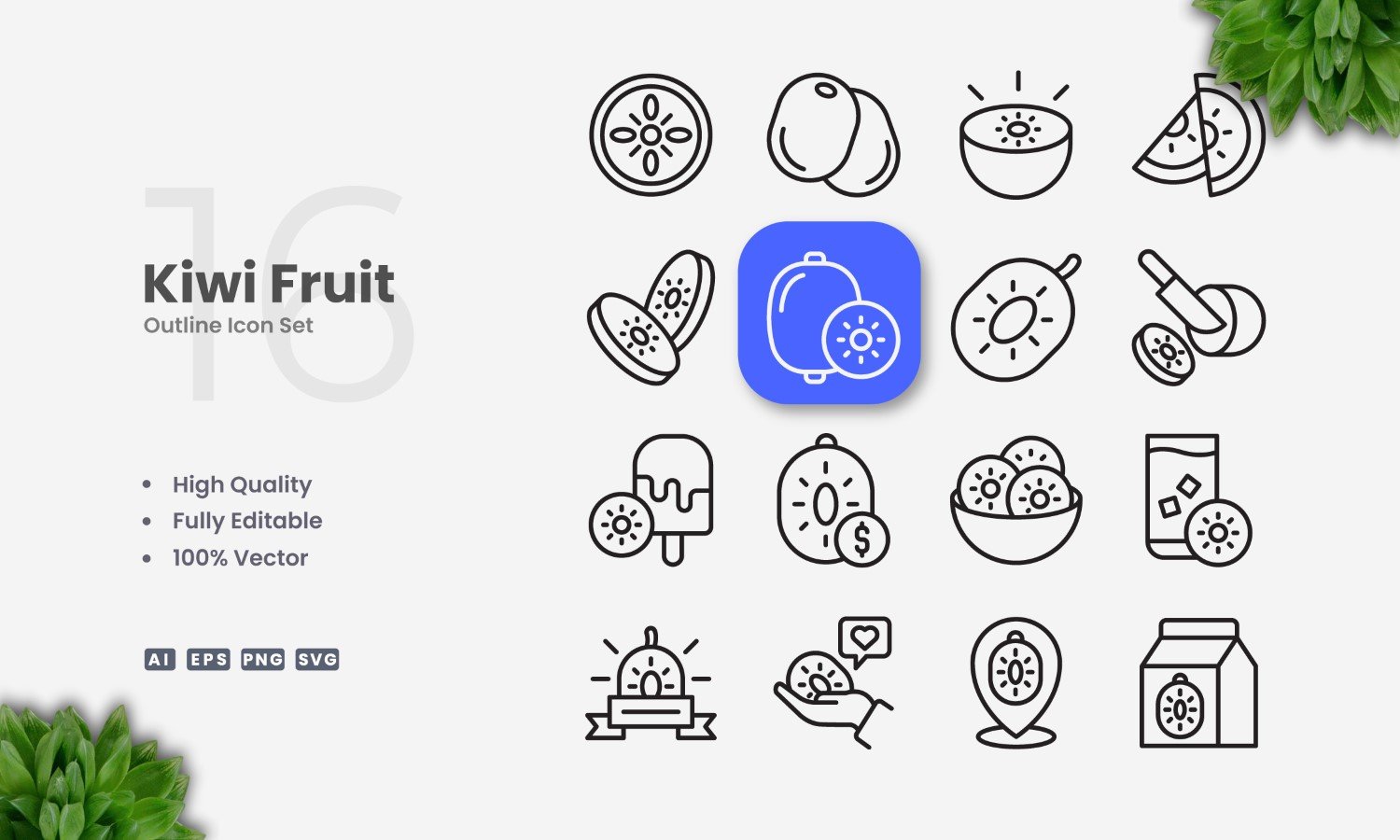 16 Kiwi Fruit Outline Icon Set