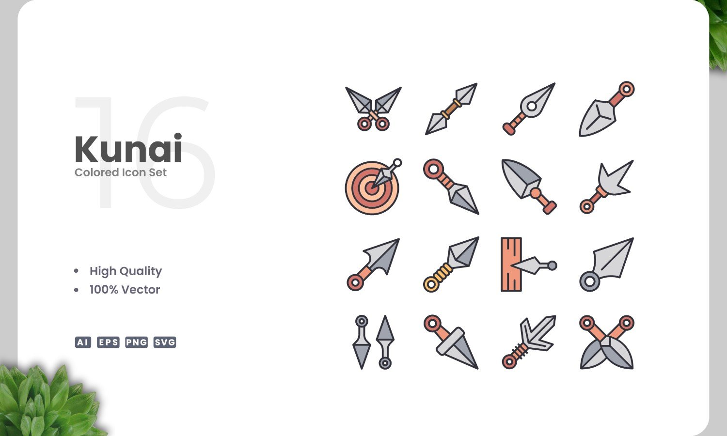 Set of 16 Kunai colored icons | Simple and clean design, perfect for websites, mobile apps, books, social media, infographics, flyer, print, banners, posters and many more. To resize or change color you can easily edit on vector software like Adobe Illustrator and CorelDRAW.