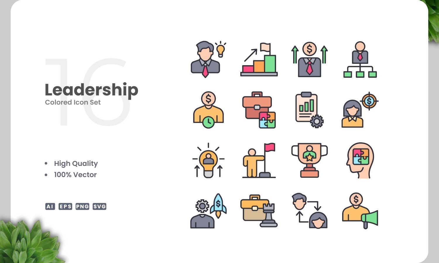 Set of 16 Leadership colored icons | Simple and clean design, perfect for websites, mobile apps, books, social media, infographics, flyer, print, banners, posters and many more. To resize or change color you can easily edit on vector software like Adobe Illustrator and CorelDRAW.