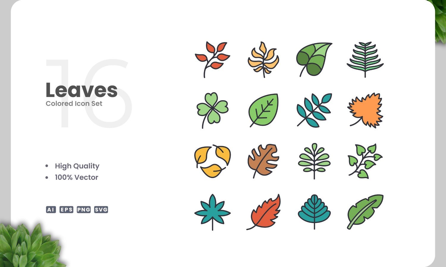 Set of 16 Leaves colored icons | Simple and clean design, perfect for websites, mobile apps, books, social media, infographics, flyer, print, banners, posters and many more. To resize or change color you can easily edit on vector software like Adobe Illustrator and CorelDRAW.