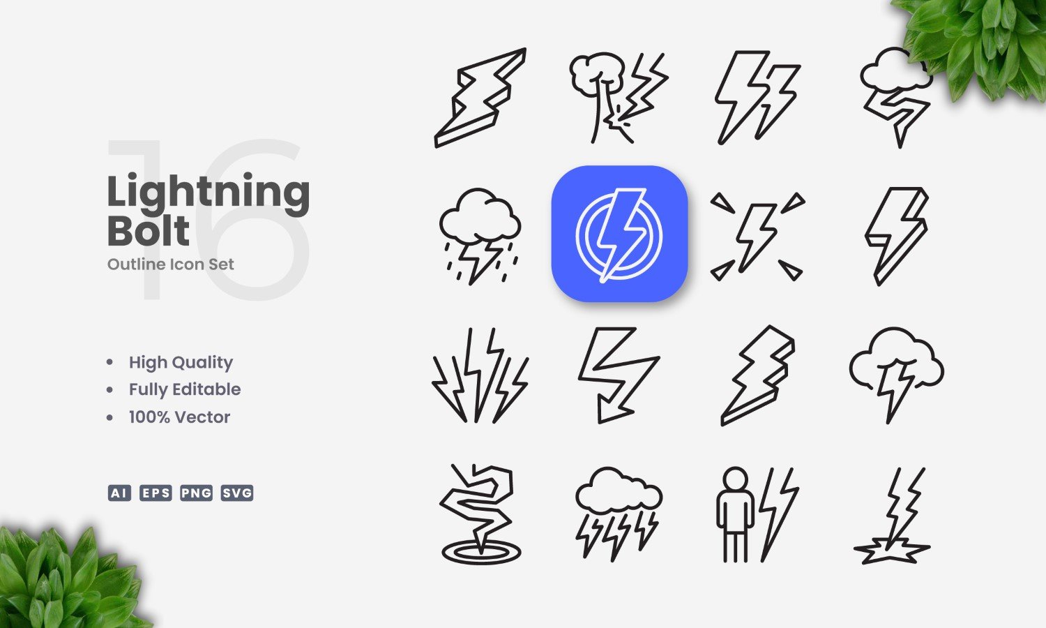 Set of 16 Lightning Bolt outline icons | Simple and clean design, perfect for websites, mobile apps, books, social media, infographics, flyer, print, banners, posters and many more. To resize, change color, or edit stroke weight, you can easily edit on vector software like Adobe Illustrator and CorelDRAW.