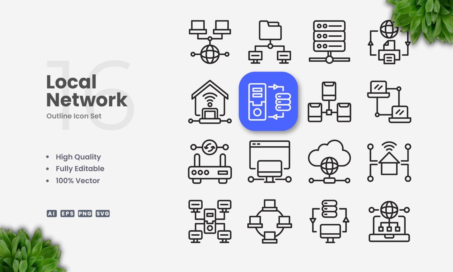 Set of 16 Local Network outline icons | Simple and clean design, perfect for websites, mobile apps, books, social media, infographics, flyer, print, banners, posters and many more. To resize, change color, or edit stroke weight, you can easily edit on vector software like Adobe Illustrator and CorelDRAW.