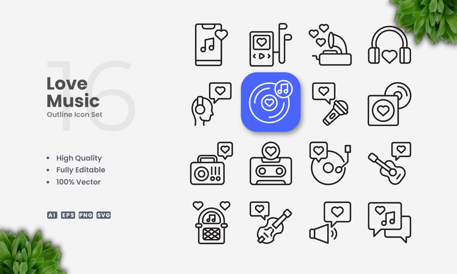 Set of 16 Love Music outline icons | Simple and clean design, perfect for websites, mobile apps, books, social media, infographics, flyer, print, banners, posters and many more. To resize, change color, or edit stroke weight, you can easily edit on vector software like Adobe Illustrator and CorelDRAW.