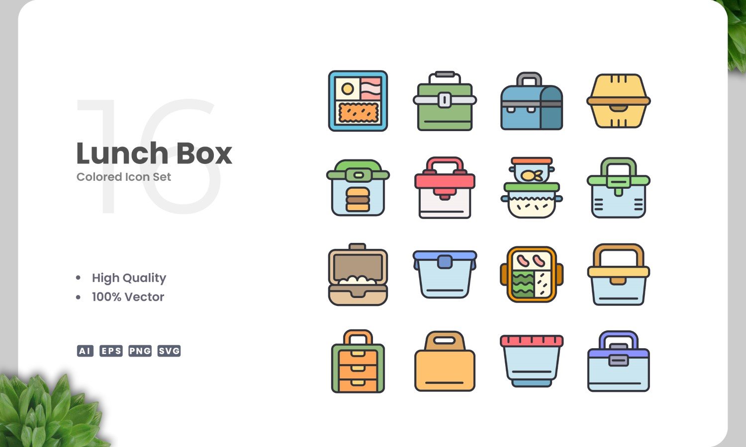 Set of 16 Lunch Box colored icons | Simple and clean design, perfect for websites, mobile apps, books, social media, infographics, flyer, print, banners, posters and many more. To resize or change color you can easily edit on vector software like Adobe Illustrator and CorelDRAW.