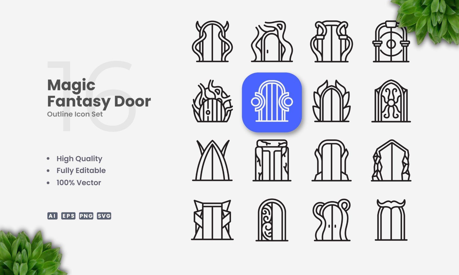 Set of 16 Magic Fantasy Door outline icons | Simple and clean design, perfect for websites, mobile apps, books, social media, infographics, flyer, print, banners, posters and many more. To resize, change color, or edit stroke weight, you can easily edit on vector software like Adobe Illustrator and CorelDRAW.