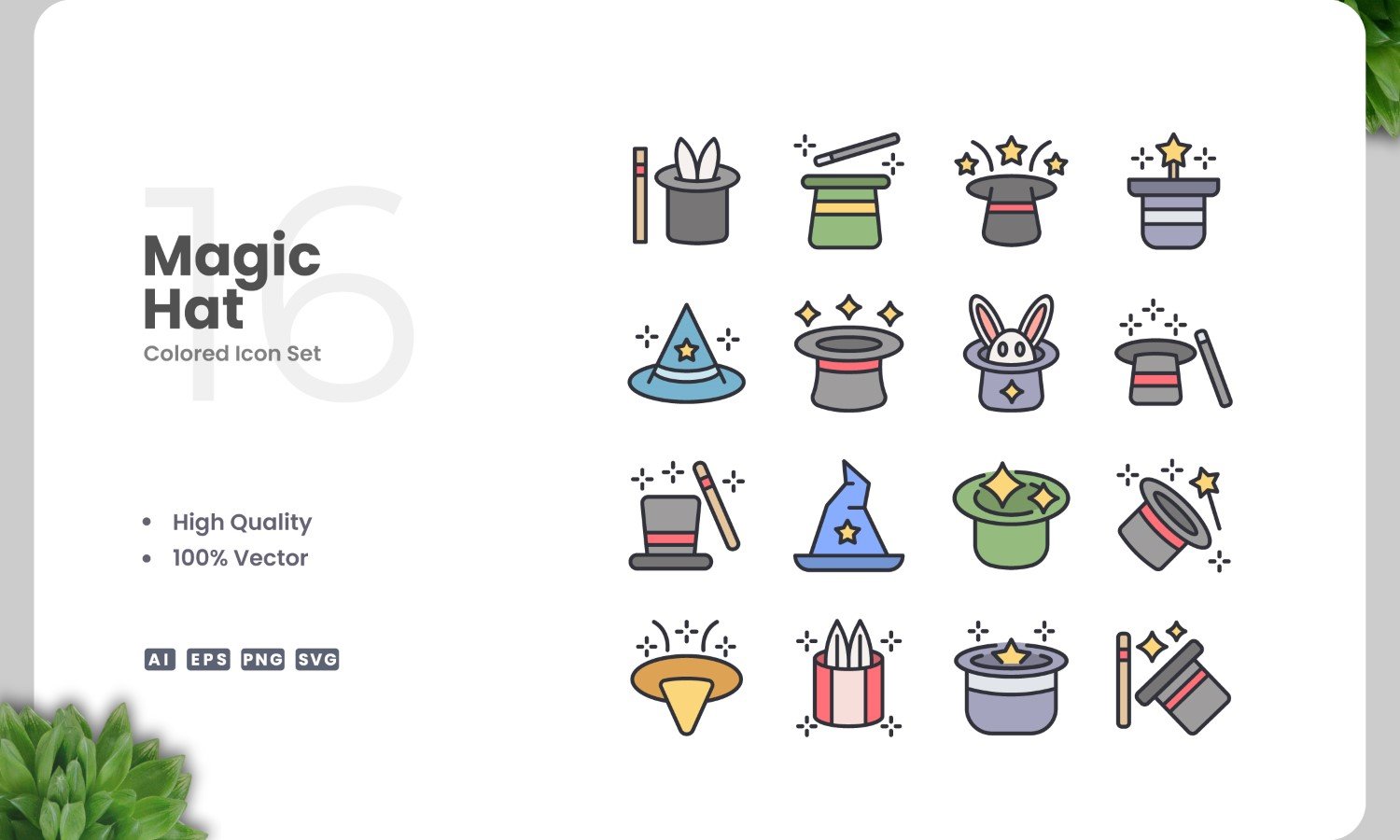 Set of 16 Magic Hat colored icons | Simple and clean design, perfect for websites, mobile apps, books, social media, infographics, flyer, print, banners, posters and many more. To resize or change color you can easily edit on vector software like Adobe Illustrator and CorelDRAW.