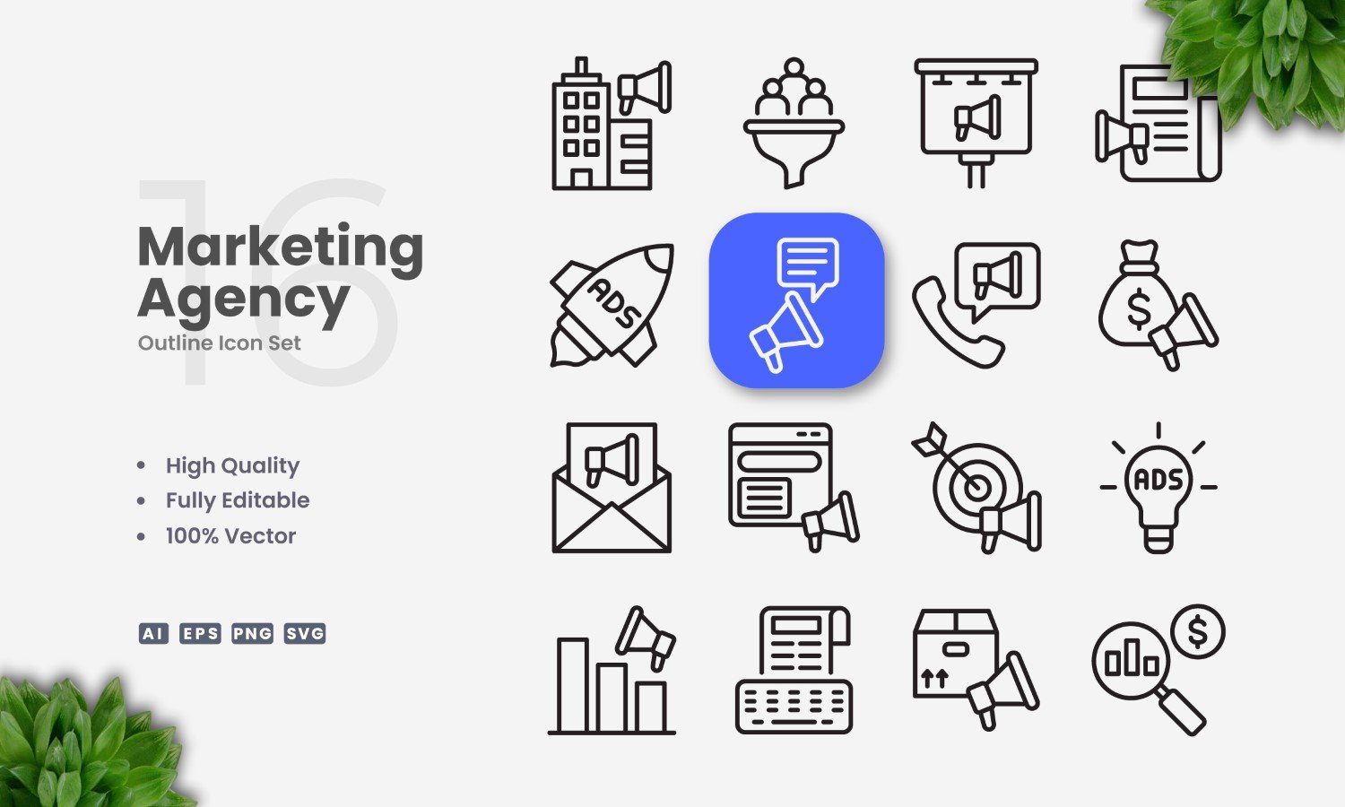 Set of 16 Marketing Agency outline icons | Simple and clean design, perfect for websites, mobile apps, books, social media, infographics, flyer, print, banners, posters and many more. To resize, change color, or edit stroke weight, you can easily edit on vector software like Adobe Illustrator and CorelDRAW.