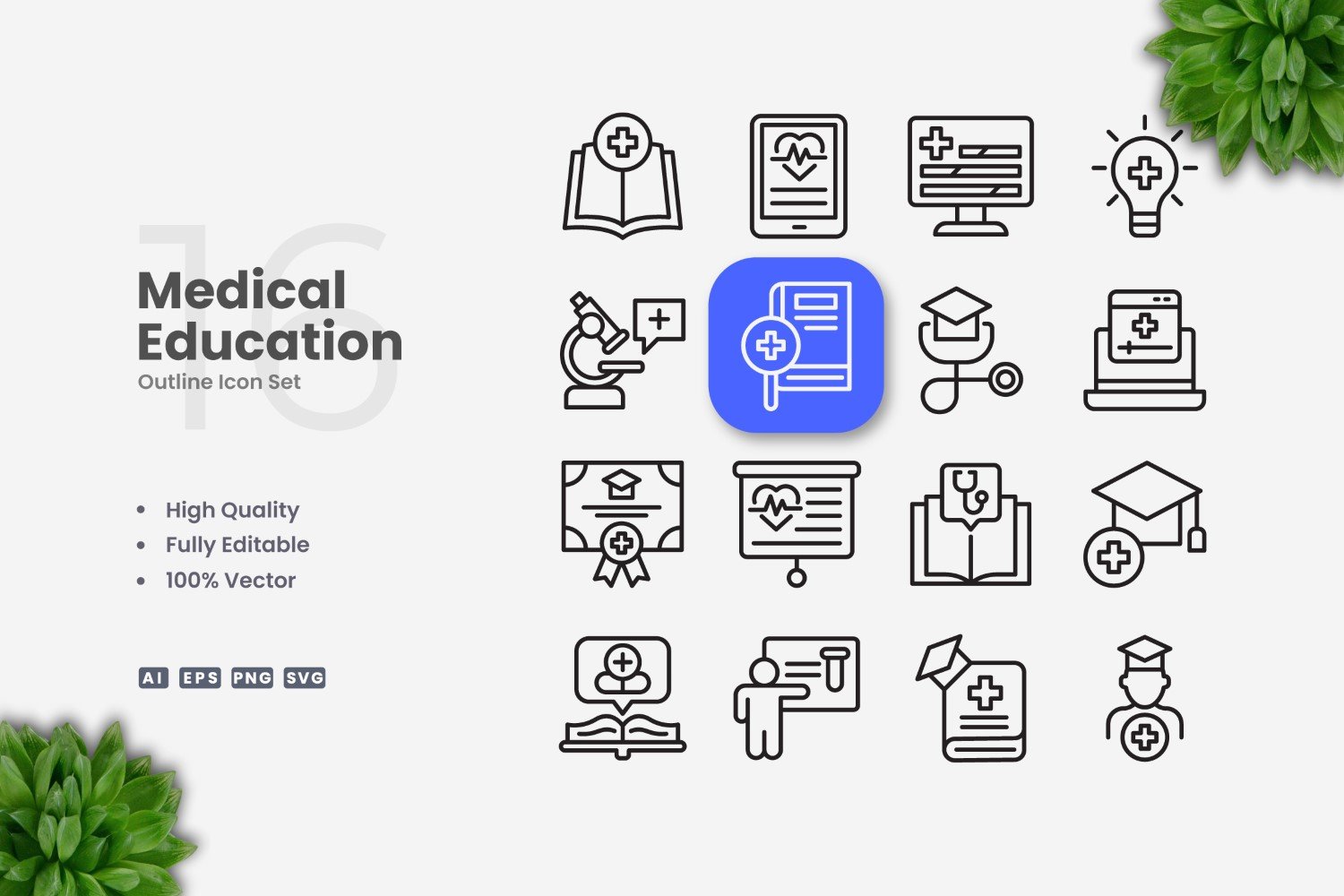 Set of 16 Medical Education outline icons | Simple and clean design, perfect for websites, mobile apps, books, social media, infographics, flyer, print, banners, posters and many more. To resize or change color you can easily edit on vector software like Adobe Illustrator and CorelDRAW.