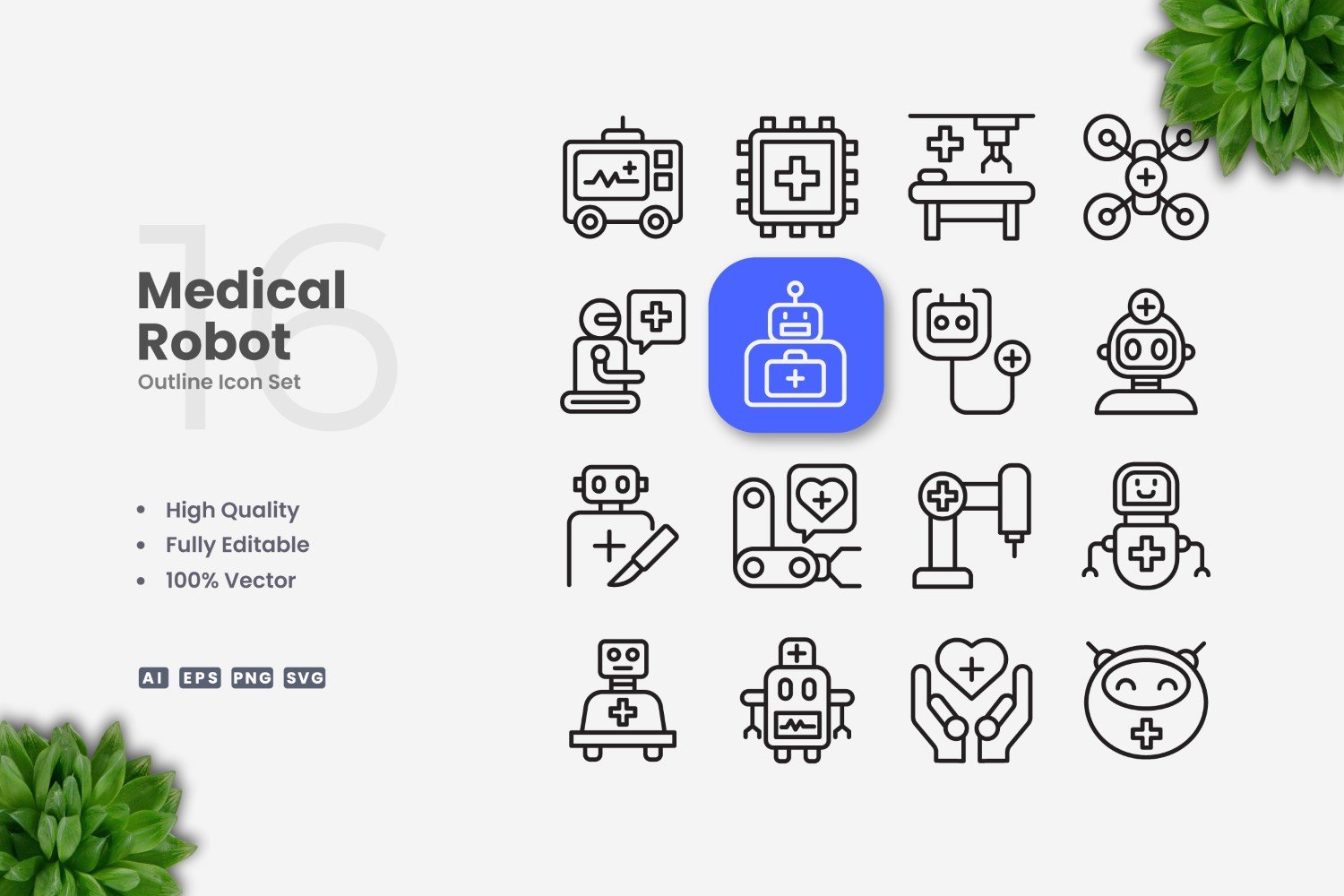 Set of 16 Medical Robot Outline Icons | Simple and clean design, perfect for websites, mobile apps, books, social media, infographics, flyer, print, banners, posters and many more. To resize or change color you can easily edit on vector software like Adobe Illustrator and CorelDRAW.