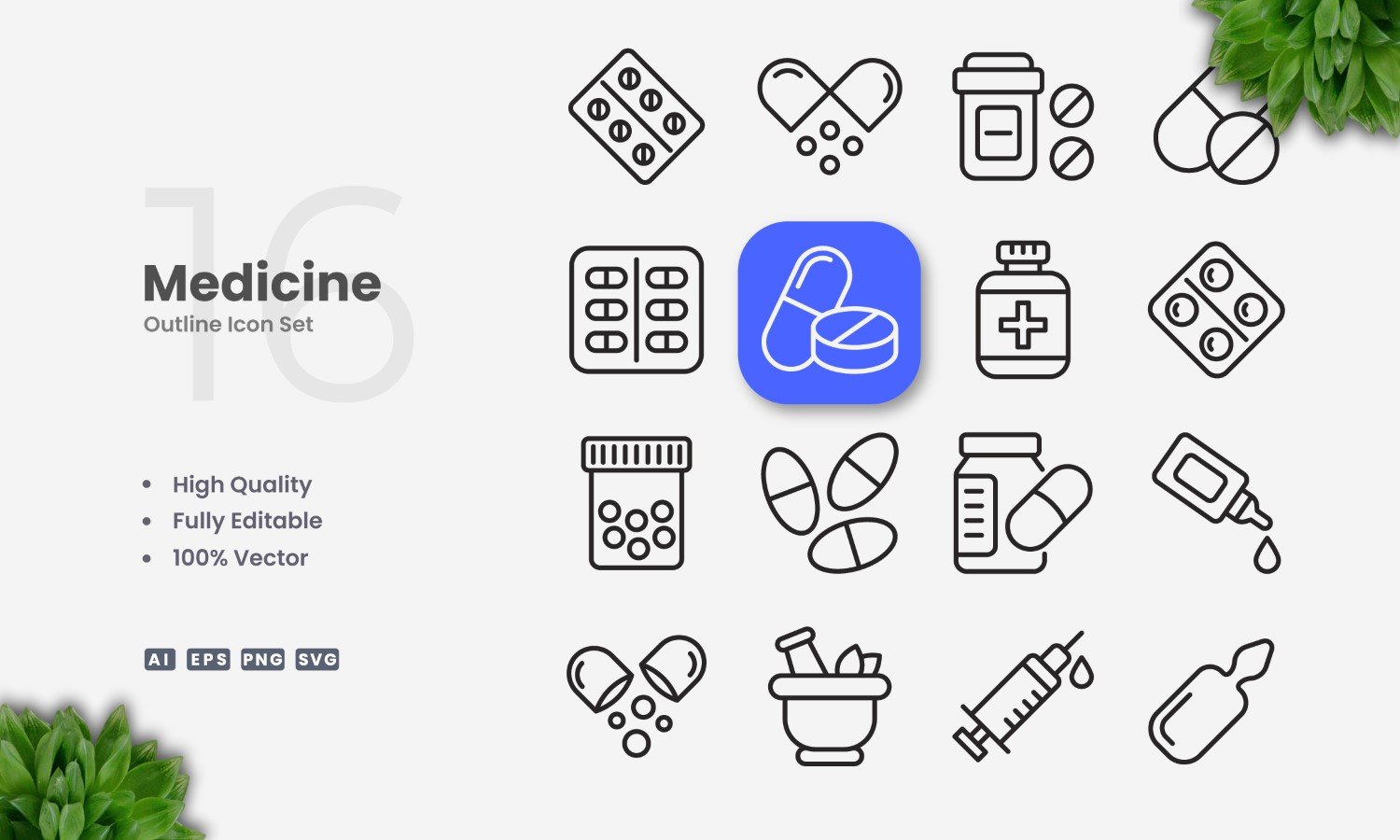 Set of 16 Medicine outline icons | Simple and clean design, perfect for websites, mobile apps, books, social media, infographics, flyer, print, banners, posters and many more. To resize, change color, or edit stroke weight, you can easily edit on vector software like Adobe Illustrator and CorelDRAW.