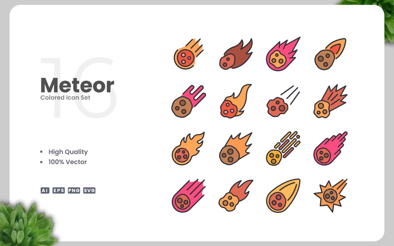 Set of 16 Meteor colored icons | Simple and clean design, perfect for websites, mobile apps, books, social media, infographics, flyer, print, banners, posters and many more. To resize or change color you can easily edit on vector software like Adobe Illustrator and CorelDRAW.