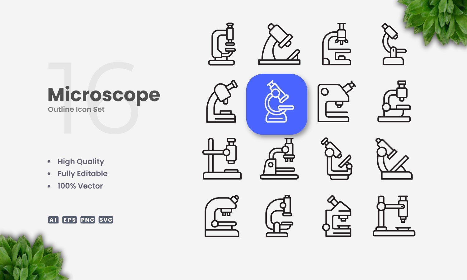 Set of 16 Microscope outline icons | Simple and clean design, perfect for websites, mobile apps, books, social media, infographics, flyer, print, banners, posters and many more. To resize, change color, or edit stroke weight, you can easily edit on vector software like Adobe Illustrator and CorelDRAW.