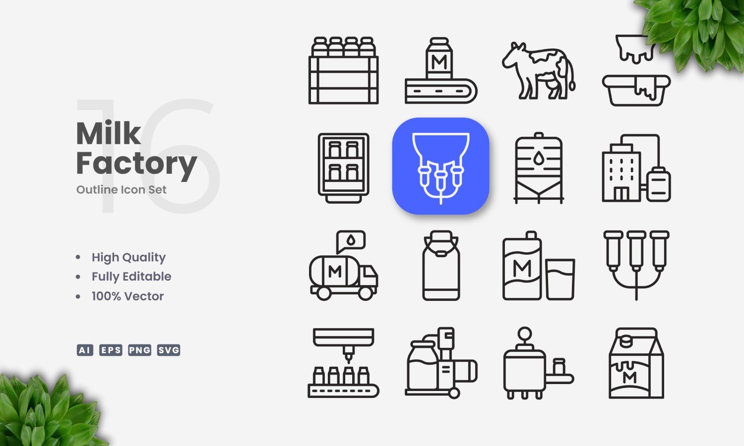 16 Milk Factory Outline Icon Set