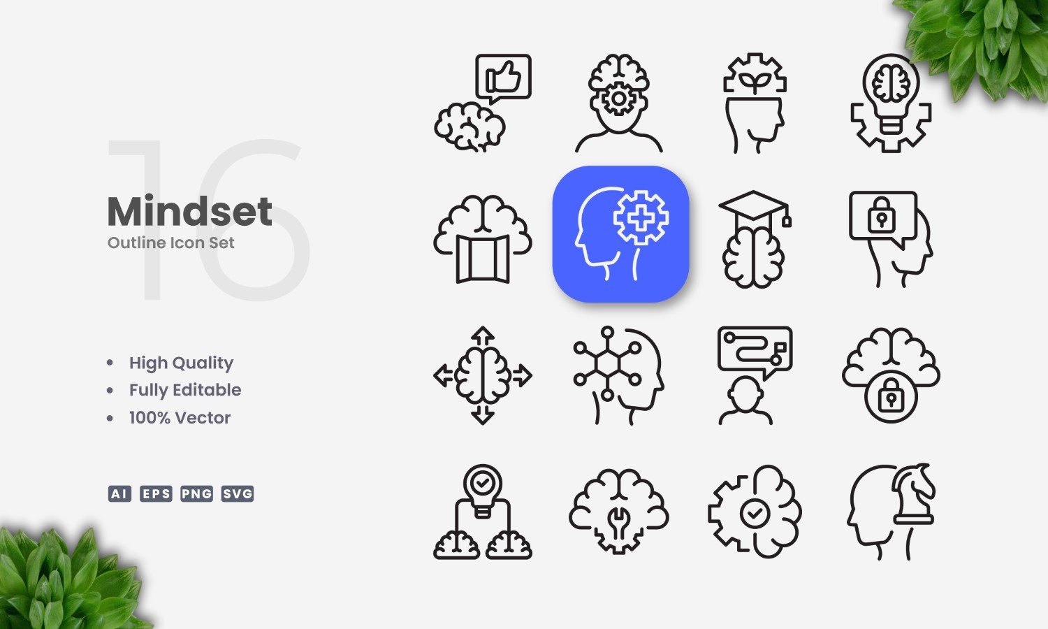 Set of 16 Mindset outline icons | Simple and clean design, perfect for websites, mobile apps, books, social media, infographics, flyer, print, banners, posters and many more. To resize, change color, or edit stroke weight, you can easily edit on vector software like Adobe Illustrator and CorelDRAW.