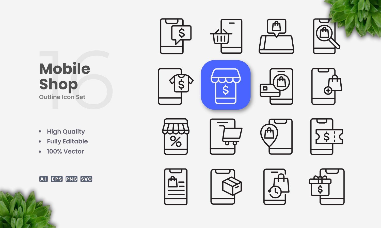 Set of 16 Mobile Shop outline icons | Simple and clean design, perfect for websites, mobile apps, books, social media, infographics, flyer, print, banners, posters and many more. To resize, change color, or edit stroke weight, you can easily edit on vector software like Adobe Illustrator and CorelDRAW.