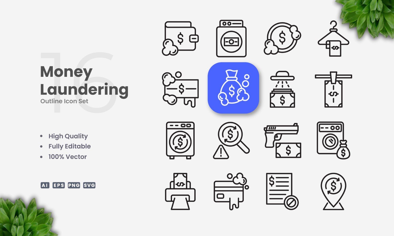 Set of 16 Money Laundering outline icons | Simple and clean design, perfect for websites, mobile apps, books, social media, infographics, flyer, print, banners, posters and many more. To resize, change color, or edit stroke weight, you can easily edit on vector software like Adobe Illustrator and CorelDRAW.