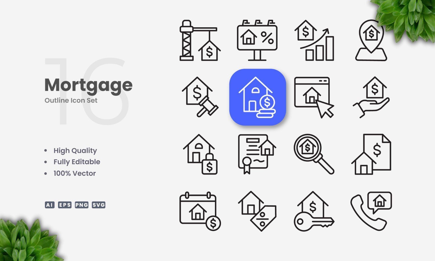 Set of 16 Mortgage outline icons | Simple and clean design, perfect for websites, mobile apps, books, social media, infographics, flyer, print, banners, posters and many more. To resize, change color, or edit stroke weight, you can easily edit on vector software like Adobe Illustrator and CorelDRAW.
