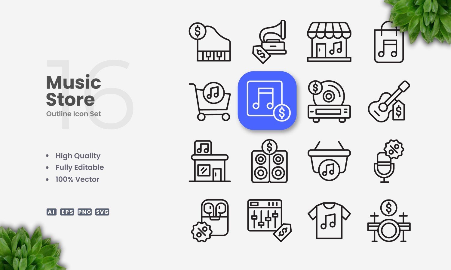 Set of 16 Music Store outline icons | Simple and clean design, perfect for websites, mobile apps, books, social media, infographics, flyer, print, banners, posters and many more. To resize, change color, or edit stroke weight, you can easily edit on vector software like Adobe Illustrator and CorelDRAW.