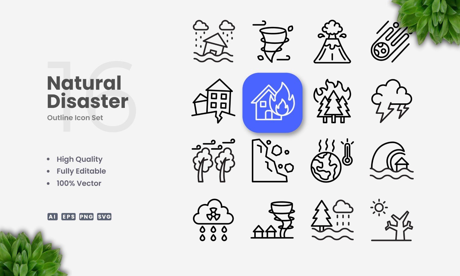 16 Natural Disaster Outline Icon Set