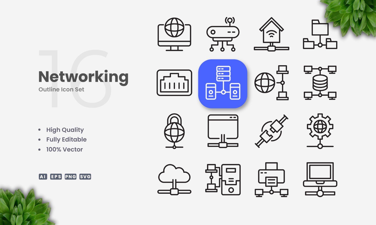 Set of 16 Networking outline icons | Simple and clean design, perfect for websites, mobile apps, books, social media, infographics, flyer, print, banners, posters and many more. To resize, change color, or edit stroke weight, you can easily edit on vector software like Adobe Illustrator and CorelDRAW.