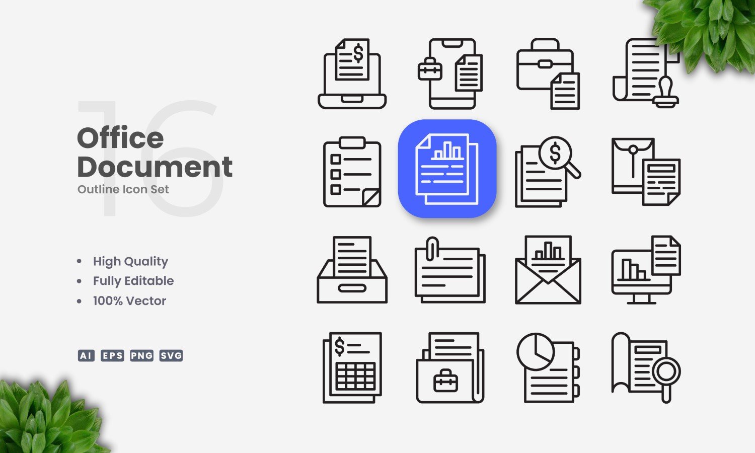 Set of 16 Office Document outline icons | Simple and clean design, perfect for websites, mobile apps, books, social media, infographics, flyer, print, banners, posters and many more. To resize, change color, or edit stroke weight, you can easily edit on vector software like Adobe Illustrator and CorelDRAW.