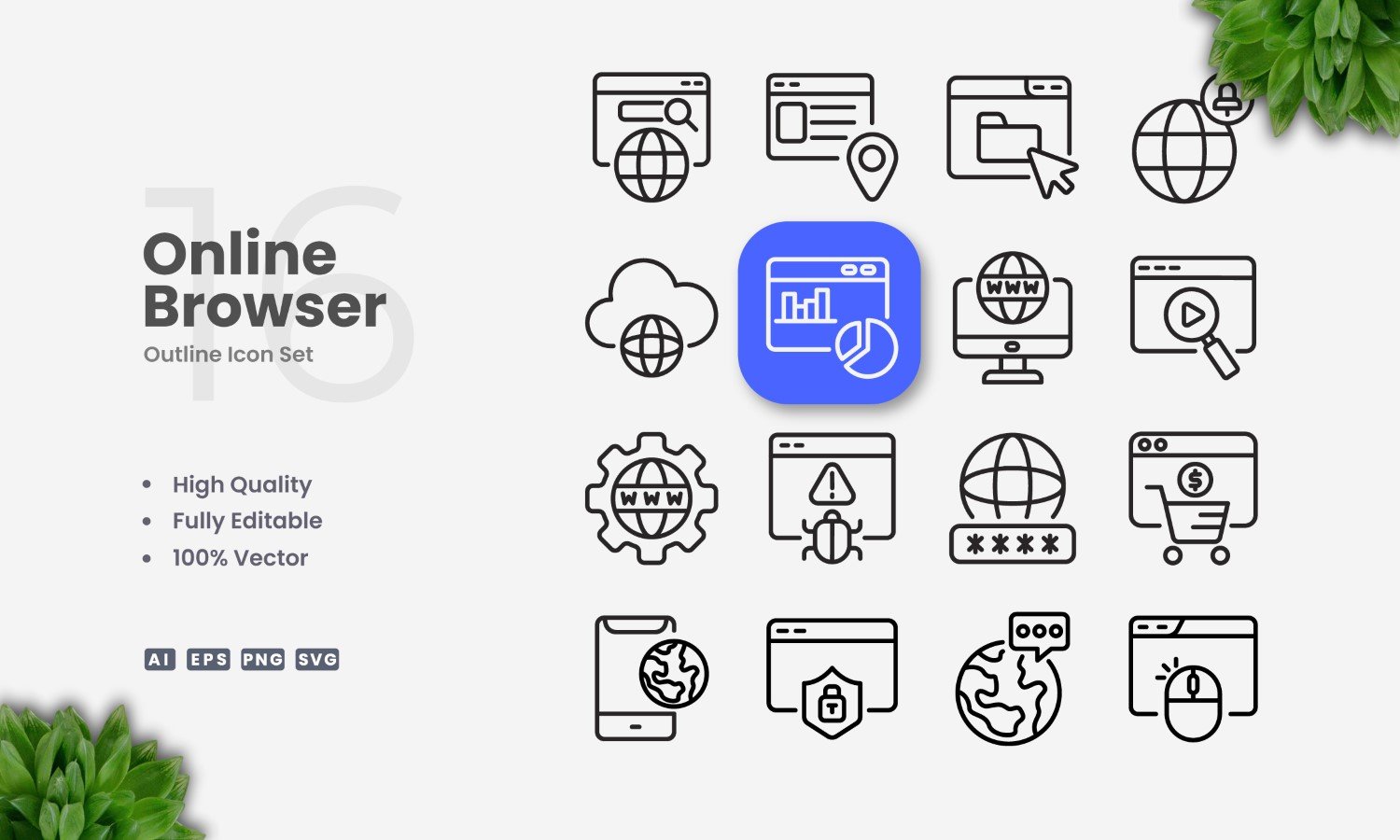 Set of 16 Online Browser outline icons | Simple and clean design, perfect for websites, mobile apps, books, social media, infographics, flyer, print, banners, posters and many more. To resize, change color, or edit stroke weight, you can easily edit on vector software like Adobe Illustrator and CorelDRAW.