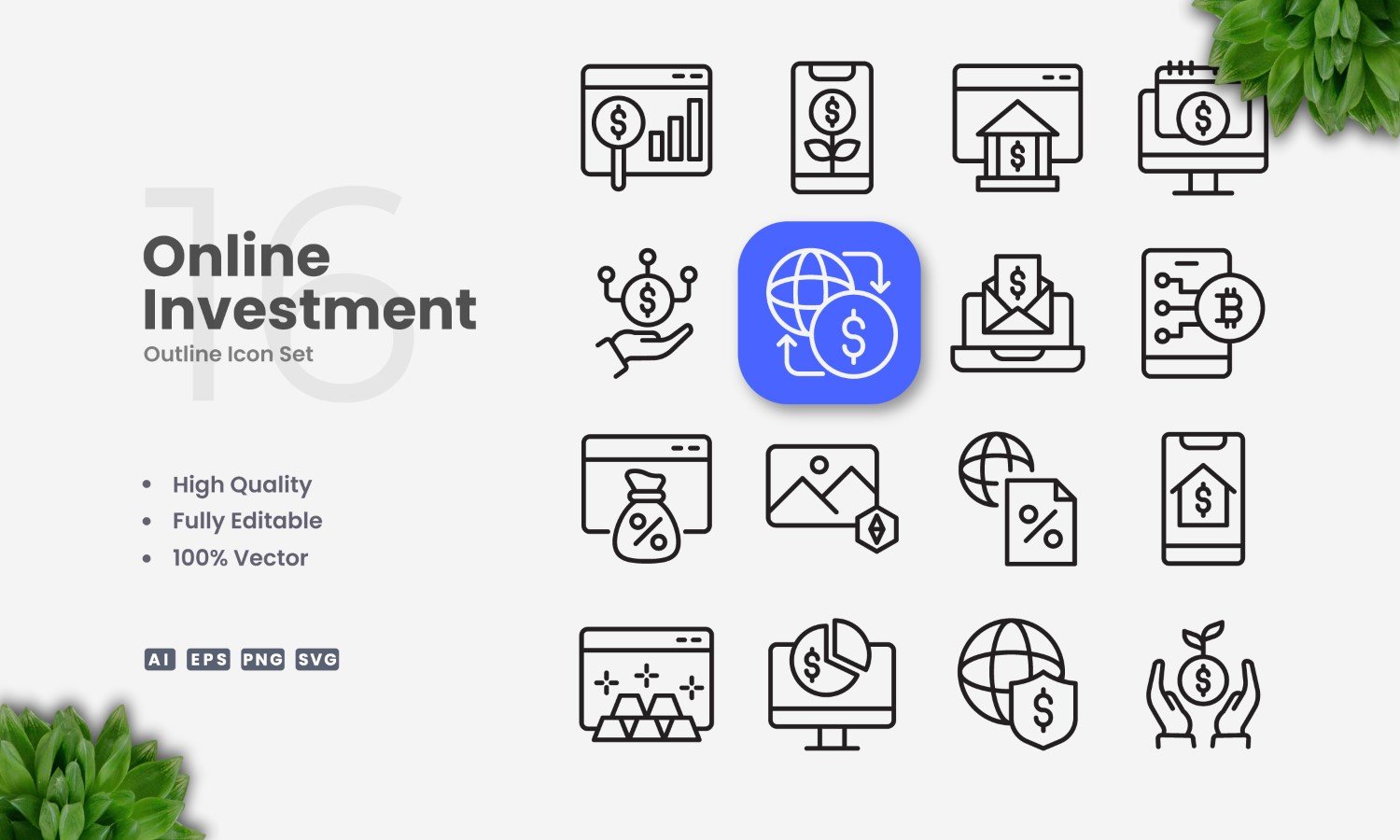 Set of 16 Online Investment outline icons | Simple and clean design, perfect for websites, mobile apps, books, social media, infographics, flyer, print, banners, posters and many more. To resize, change color, or edit stroke weight, you can easily edit on vector software like Adobe Illustrator and CorelDRAW.