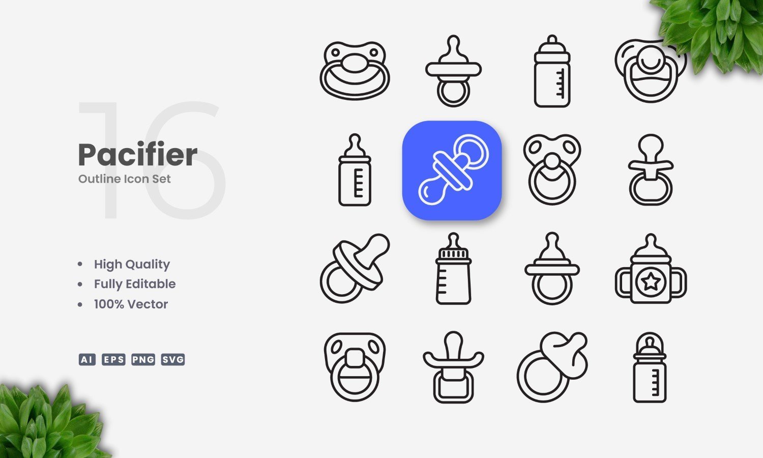 Set of 16 Pacifier outline icons | Simple and clean design, perfect for websites, mobile apps, books, social media, infographics, flyer, print, banners, posters and many more. To resize, change color, or edit stroke weight, you can easily edit on vector software like Adobe Illustrator and CorelDRAW.