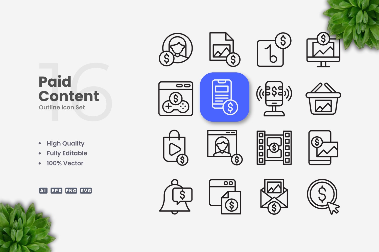 Set of 16 Paid Content Outline Icons | Simple and clean design, perfect for websites, mobile apps, books, social media, infographics, flyer, print, banners, posters and many more. To resize or change color you can easily edit on vector software like Adobe Illustrator and CorelDRAW.