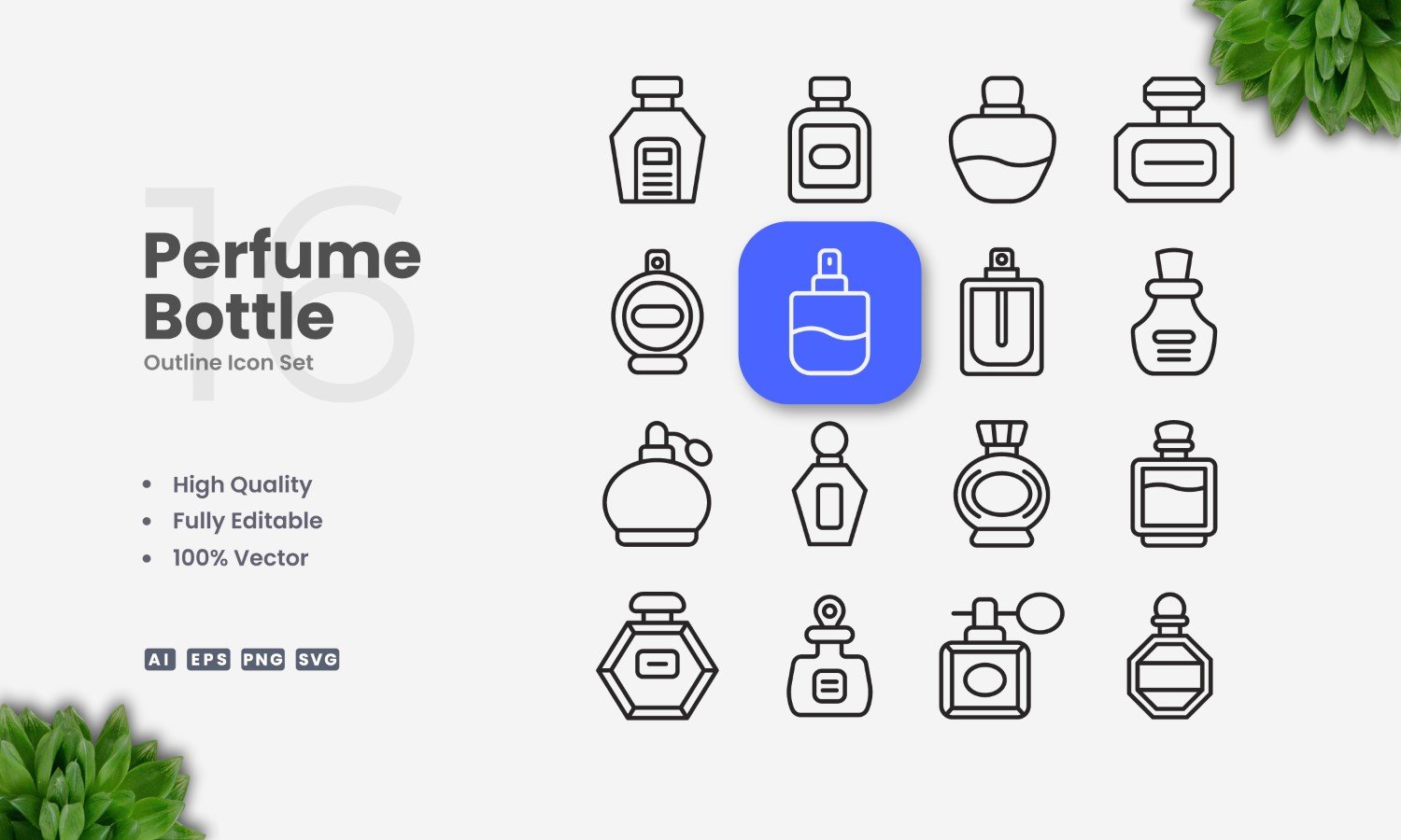 Set of 16 Perfume Bottle outline icons | Simple and clean design, perfect for websites, mobile apps, books, social media, infographics, flyer, print, banners, posters and many more. To resize, change color, or edit stroke weight, you can easily edit on vector software like Adobe Illustrator and CorelDRAW.