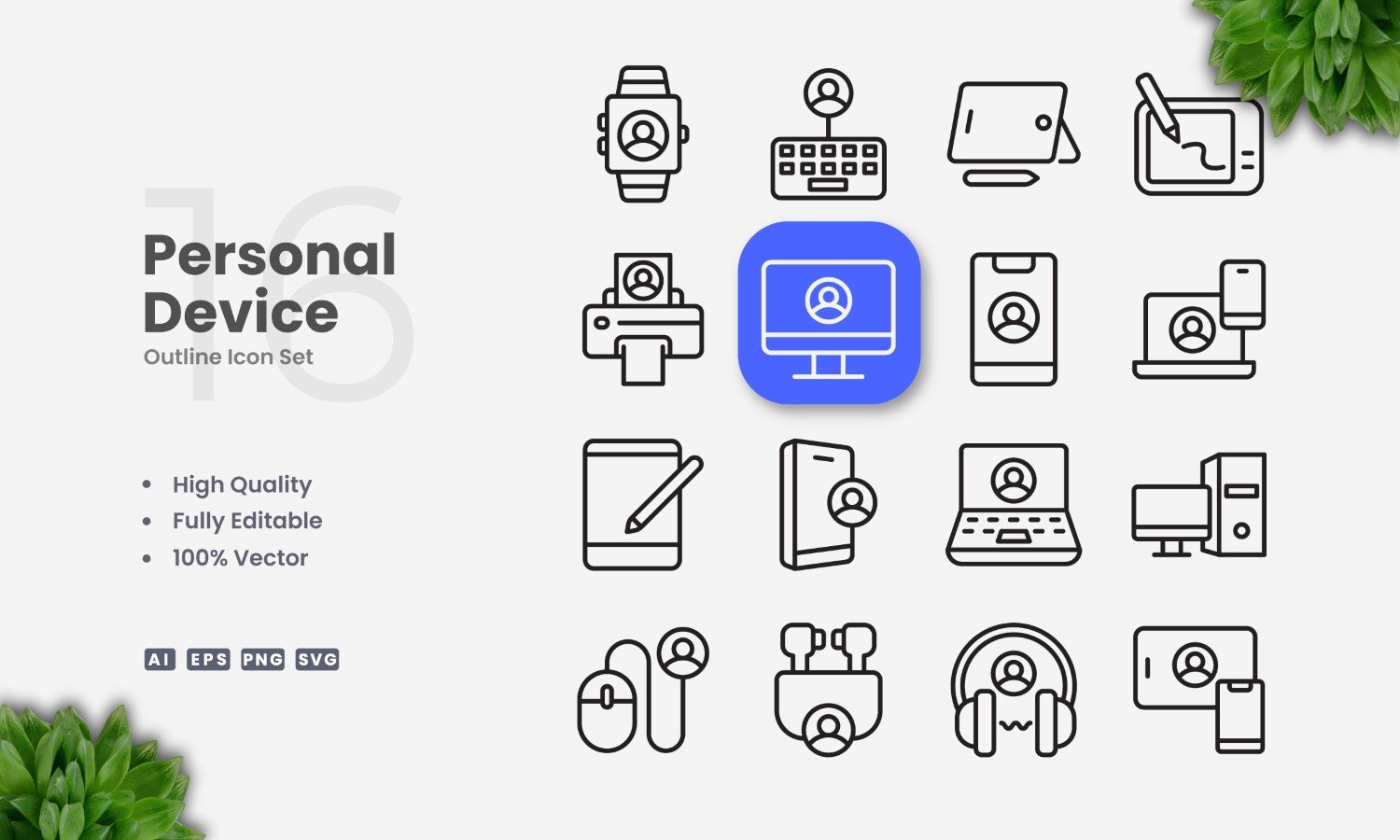 Set of 16 Personal Device outline icons | Simple and clean design, perfect for websites, mobile apps, books, social media, infographics, flyer, print, banners, posters and many more. To resize, change color, or edit stroke weight, you can easily edit on vector software like Adobe Illustrator and CorelDRAW.