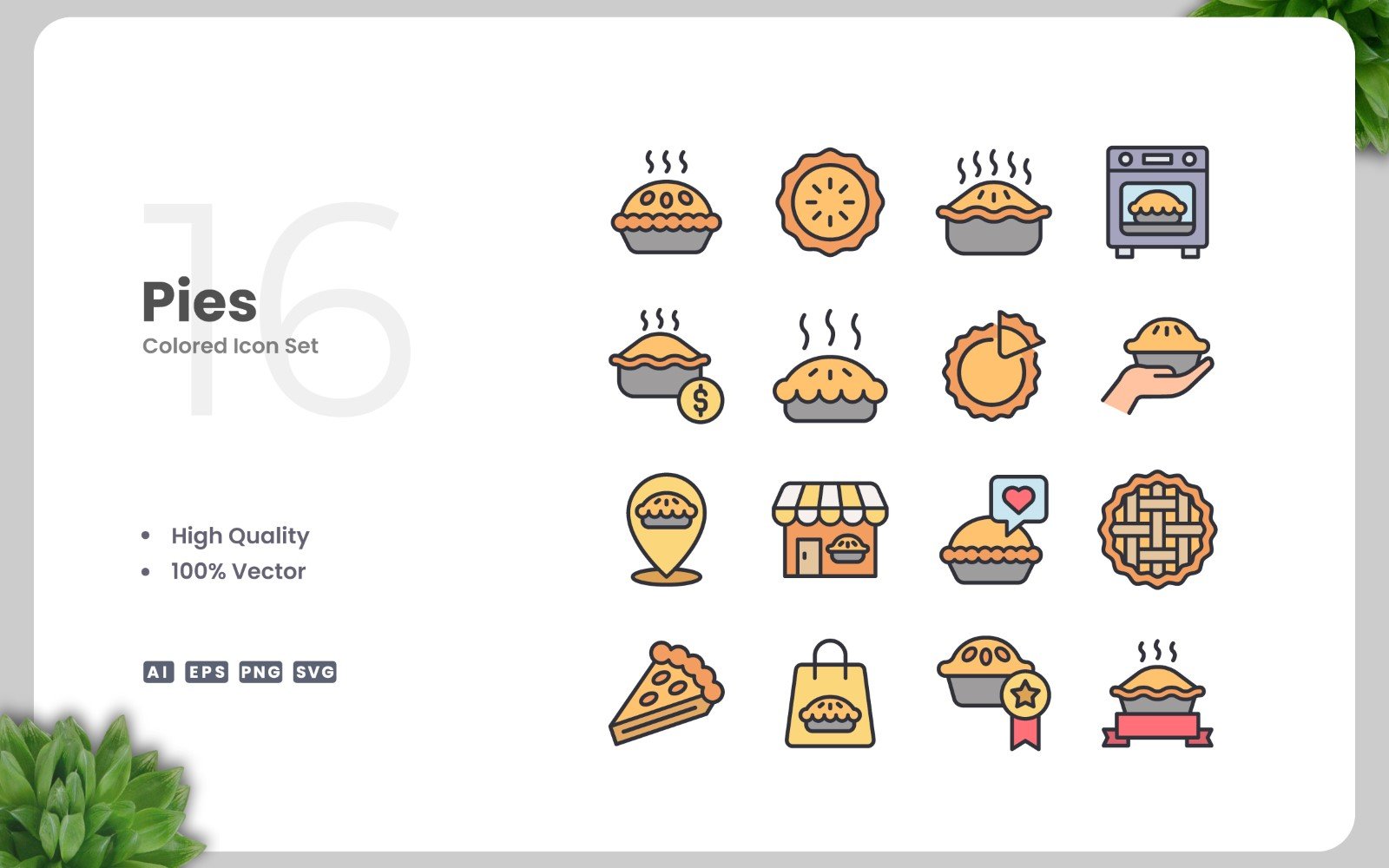 Set of 16 Pies colored icons | Simple and clean design, perfect for websites, mobile apps, books, social media, infographics, flyer, print, banners, posters and many more. To resize or change color you can easily edit on vector software like Adobe Illustrator and CorelDRAW.