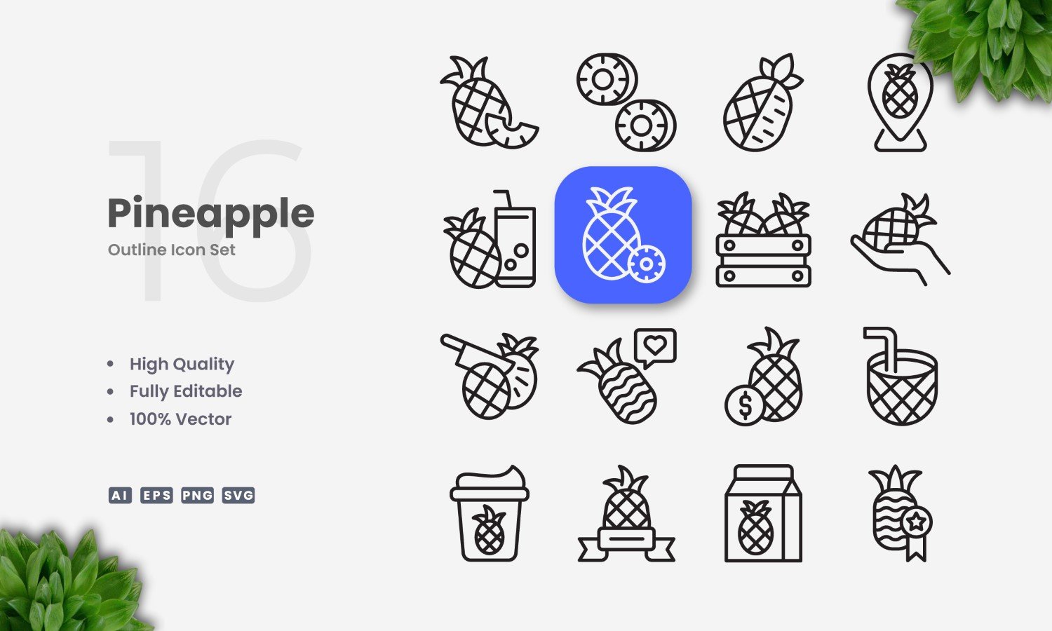 Set of 16 Pineapple outline icons | Simple and clean design, perfect for websites, mobile apps, books, social media, infographics, flyer, print, banners, posters and many more. To resize, change color, or edit stroke weight, you can easily edit on vector software like Adobe Illustrator and CorelDRAW.