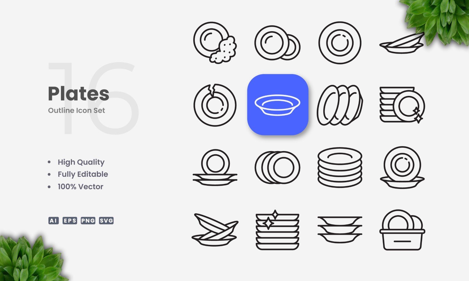 Set of 16 Plates outline icons | Simple and clean design, perfect for websites, mobile apps, books, social media, infographics, flyer, print, banners, posters and many more. To resize, change color, or edit stroke weight, you can easily edit on vector software like Adobe Illustrator and CorelDRAW.