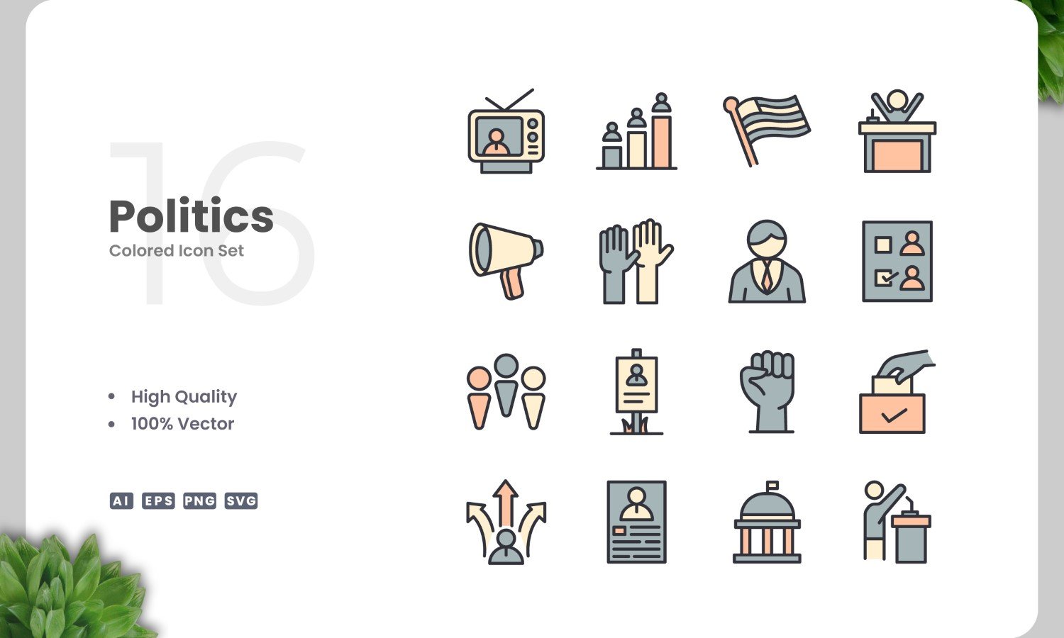 Set of 16 Politics color icons | Simple and clean design, perfect for websites, mobile apps, books, social media, infographics, flyer, print, banners, posters and many more. To resize or change color you can easily edit on vector software like Adobe Illustrator and CorelDRAW.