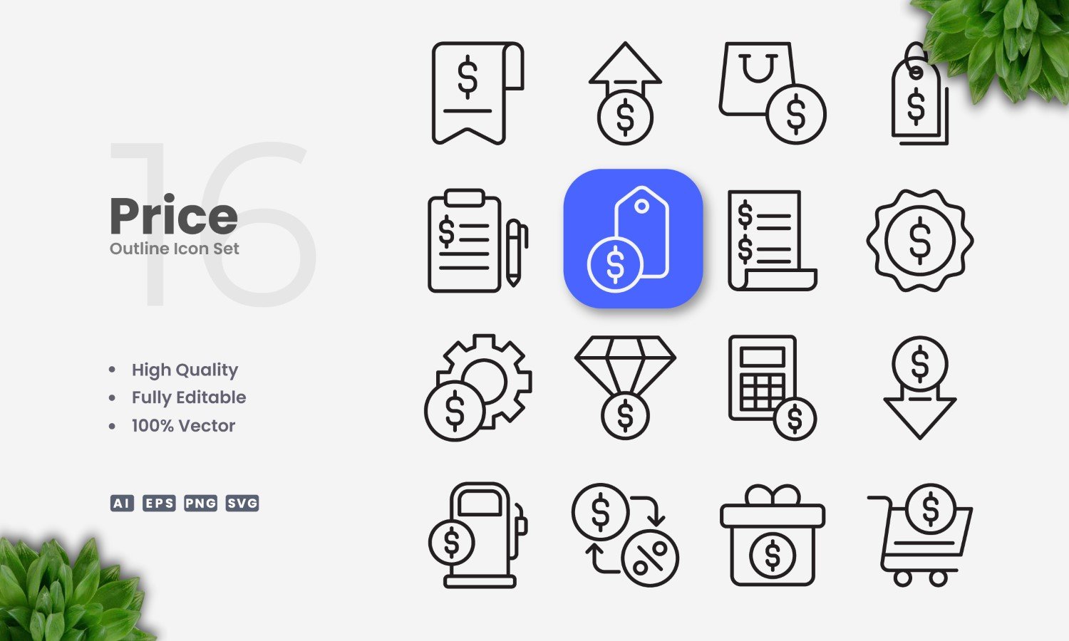 Set of 16 Price outline icons | Simple and clean design, perfect for websites, mobile apps, books, social media, infographics, flyer, print, banners, posters and many more. To resize, change color, or edit stroke weight, you can easily edit on vector software like Adobe Illustrator and CorelDRAW.