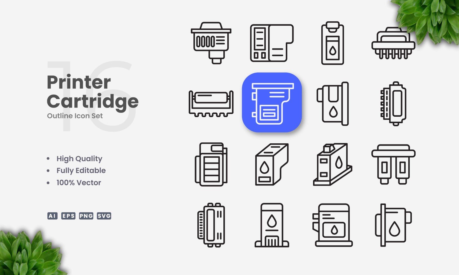 Set of 16 Printer Cartridge outline icons | Simple and clean design, perfect for websites, mobile apps, books, social media, infographics, flyer, print, banners, posters and many more. To resize, change color, or edit stroke weight, you can easily edit on vector software like Adobe Illustrator and CorelDRAW.
